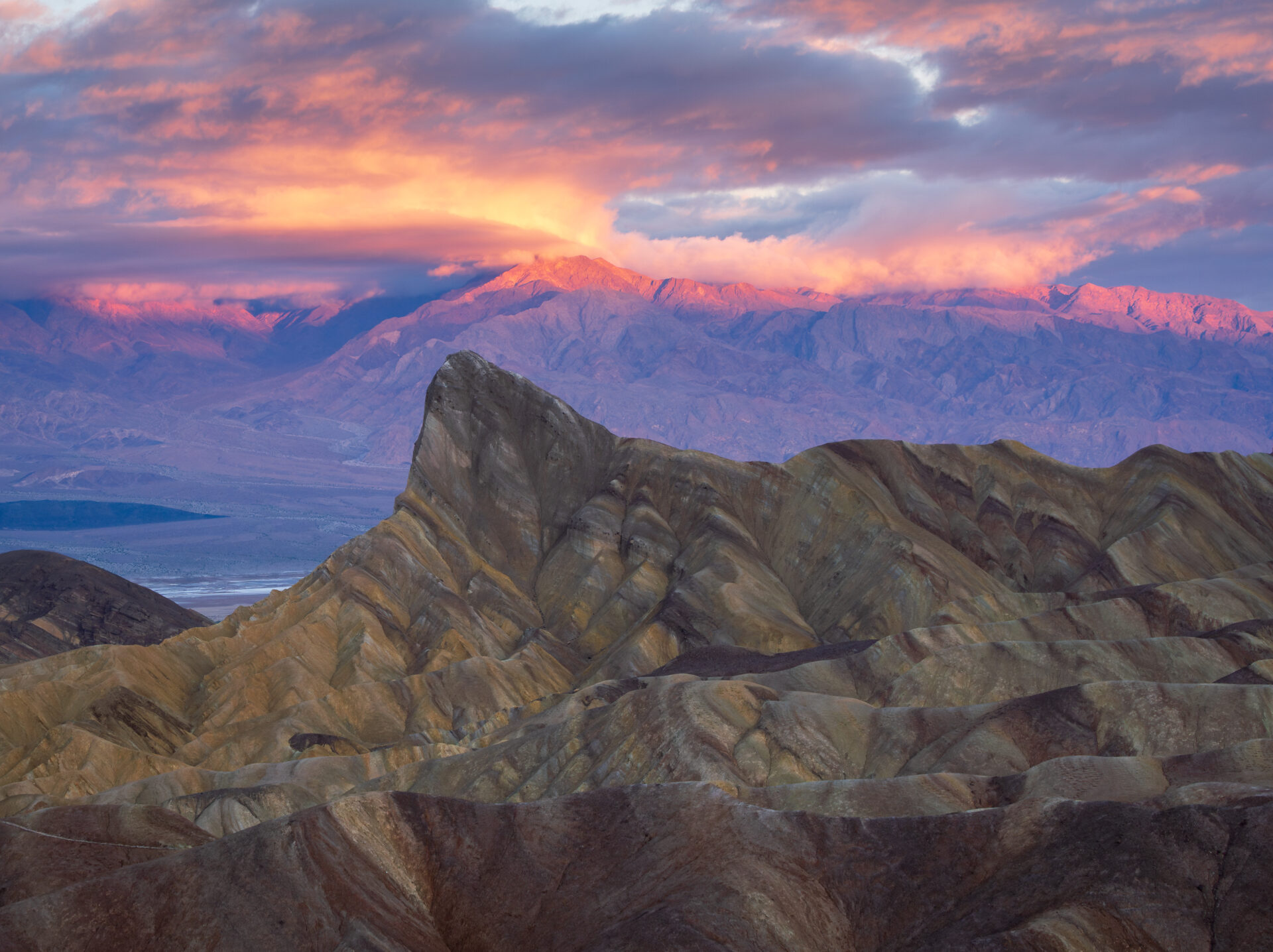 Twice I went to Zabriskie Point to catch the sunrise. The first time, it rained hard, and the sunrise was a completely bust. But I returned the next day and the clouds to the west created a beautiful blue, lavender, and pink backdrop for the purple Panamint Mountains in the distance and the prominent Manly Beacon and the surrounding yellow and brown striped badlands hills below. Two hikers on the hills in the foreground provide much-welcome scale.