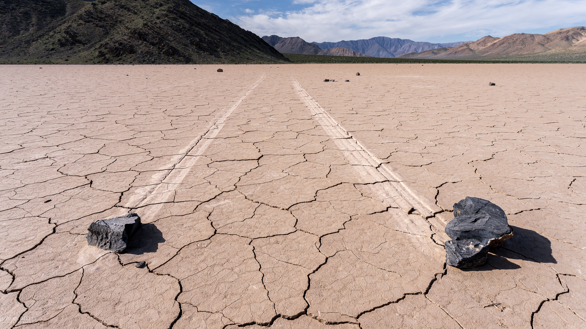 Racetrack Playa is one of the flattest surfaces in North America, where rocks that fall from the surrounding mountains become “sailing stones” – they move across the desert floor leaving tracks behind. At the northwest end of Racetrack Playa is the Grandstand – a dark monolith that is the only feature of the playa other than the moving rocks.